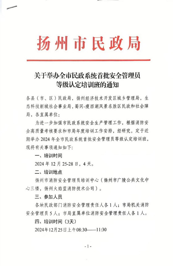 在江蘇民政系統,消防安全管理員的推廣和應用正在逐步展開(kāi),近期,江蘇省民政廳印發(fā)了2025年全省民政安全生產(chǎn)工作要點(diǎn),要點(diǎn)中提出:推廣揚州市民政局組織機關(guān)干部全員參加消防安全管理員職業(yè)技能培訓考核做法,提升發(fā)現問(wèn)題和指導解決問(wèn)題的能力水平。幫助安全管理基礎薄弱的機構健全制度、排查隱患、閉環(huán)整治。這一舉措充分體現了政府部門(mén)對消防安全管理工作的高度重視,也是全國民政系統中的一次創(chuàng )新。