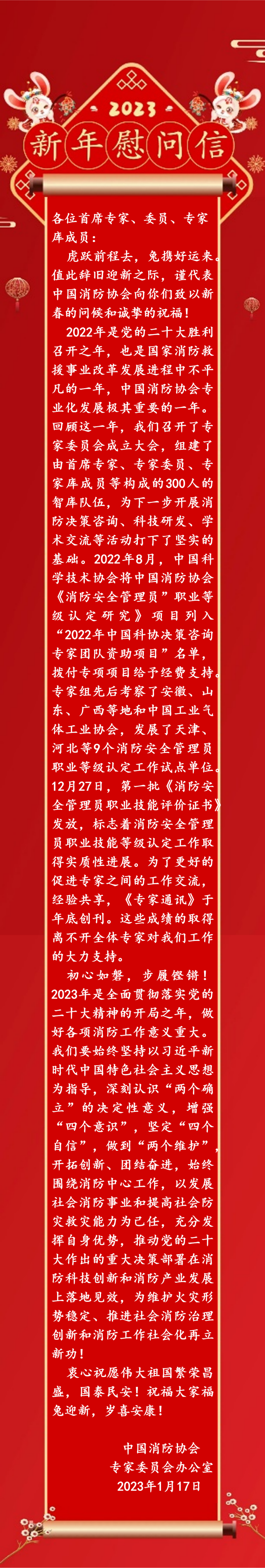 中國消防協(xié)會(huì )向專(zhuān)家委員會(huì )全體專(zhuān)家發(fā)出新春慰問(wèn)信
