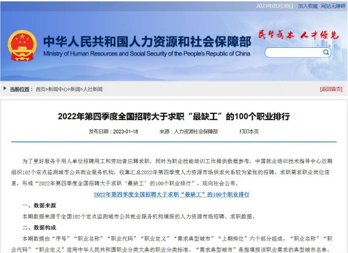 為了更好服務(wù)于用人單位招聘用工和勞動(dòng)者應聘求職,同時(shí)為職業(yè)技能培訓工作提供數據參考,人設部中國就業(yè)培訓技術(shù)指導中心近期組織102個(gè)定點(diǎn)監測城市公共就業(yè)服務(wù)機構,收集匯總2022年第四季度人力資源市場(chǎng)供求關(guān)系較為緊張的招聘、求職需求職業(yè)崗位信息,形成“2022年第四季度全國招聘大于求職‘最缺工’的100個(gè)職業(yè)排行”,面向社會(huì )公布。其中“消防安全管理員”職業(yè)上榜,排行第98位。這是消防職業(yè)第一次列上全國“最缺工”的100個(gè)職業(yè)排行!