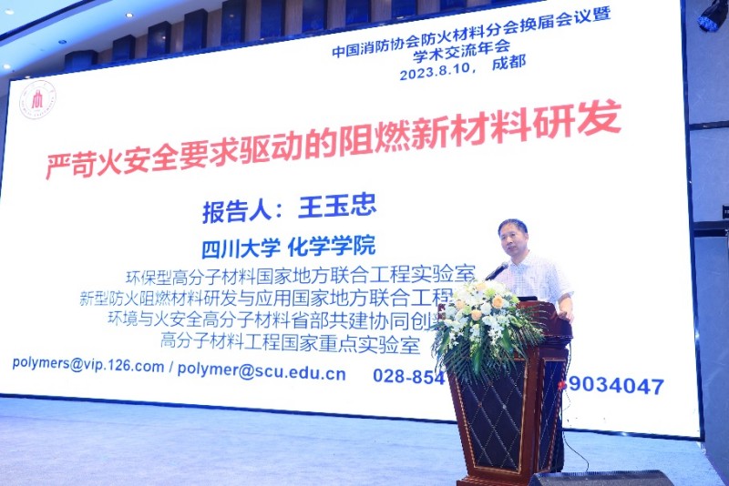 中國工程院院士、四川大學(xué)王玉忠教授做題為《嚴苛火安全要求驅動(dòng)的阻燃新材料研發(fā)》的特邀報告,從法律法規驅動(dòng)與材料阻燃需求,阻燃劑發(fā)展方向及設計介紹了防火阻燃領(lǐng)域前沿發(fā)展,并分享了在軌道列車(chē)與大飛機、電子電氣、防護領(lǐng)域的纖維紡織品/無(wú)紡布、建筑材料、電動(dòng)汽車(chē)與儲能、鋰離子電池等的領(lǐng)域的新需求與取得的重要成果。王院士的報告內容豐富、重點(diǎn)突出,點(diǎn)出了防火阻燃領(lǐng)域的重大需求與當前最先進(jìn)的理論、技術(shù)與成果,并對未來(lái)發(fā)展提出了展望,為防火材料分會(huì )開(kāi)拓了思路,指引了方向。