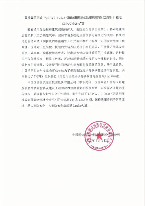 中國消防協(xié)會(huì )團體標準T/CFPA 012-2022《消防用壓接式涂覆碳鋼管材及管件》應用于CMA/CNAS擴項