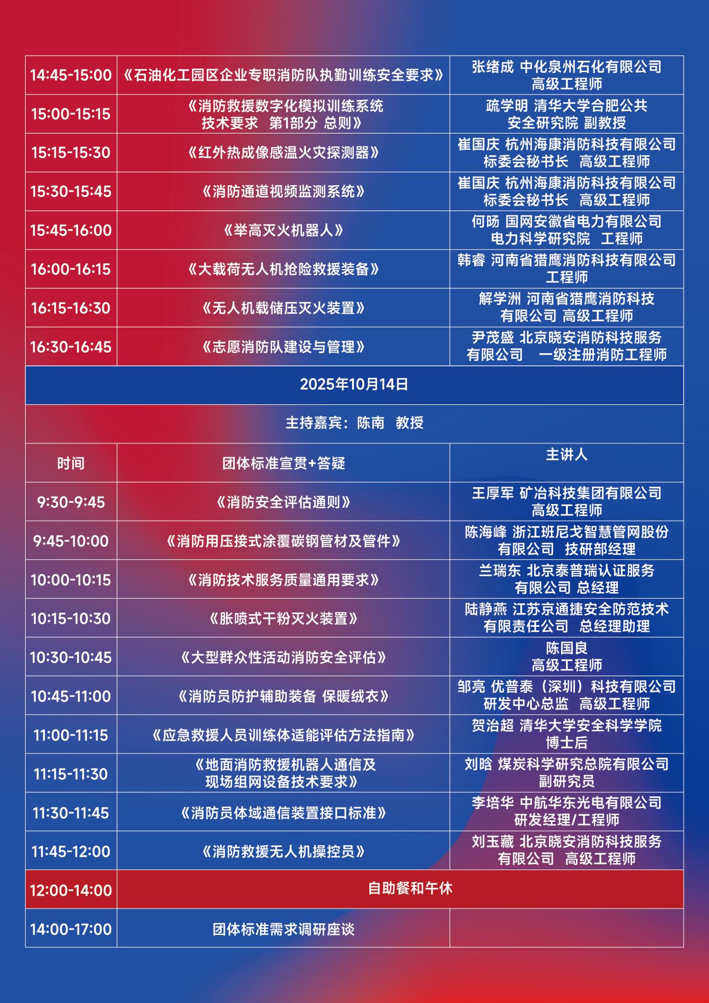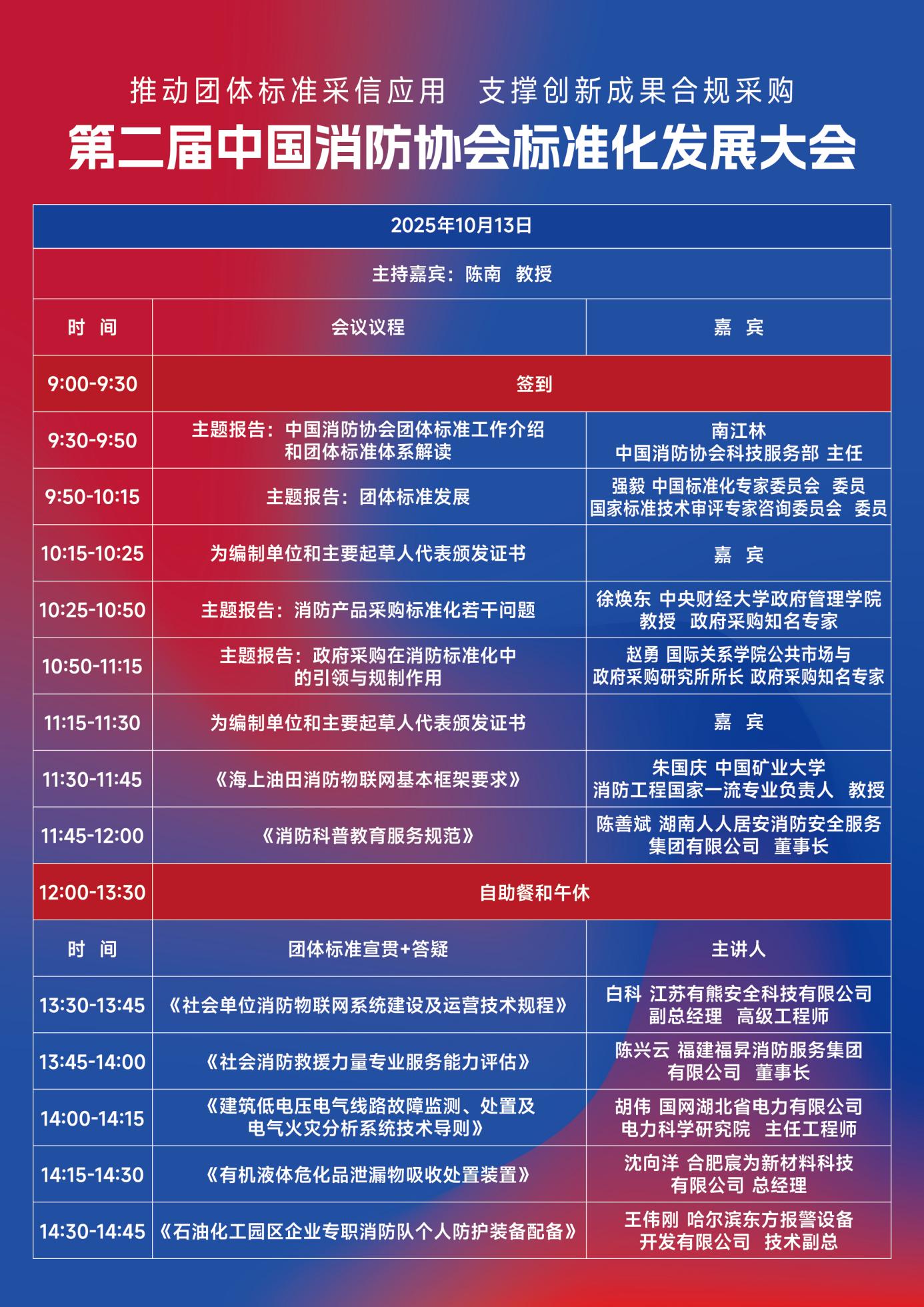 2025年10月13日至14日,第二屆中國消防協(xié)會(huì )標準化發(fā)展大會(huì )將在中國國際展覽中心W201會(huì )議室召開(kāi)。政府采購知名專(zhuān)家將解讀消防標準在政府采購中的作用,逐一宣貫25部中國消防協(xié)會(huì )團體標準,并為團體標準編制者頒發(fā)榮譽(yù)證書(shū),支撐團體標準的消防創(chuàng )新成果將在主會(huì )場(chǎng)的序廳展出。歡迎積極參與!